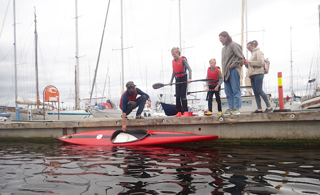 Etterpå dro jeg inn for å sjekke hva som skjedde ved flattvannskajakk/surfski-prøvinga. Fernando hjalp noen unge padlere å ta sine første åretak i flattvannskajakk.